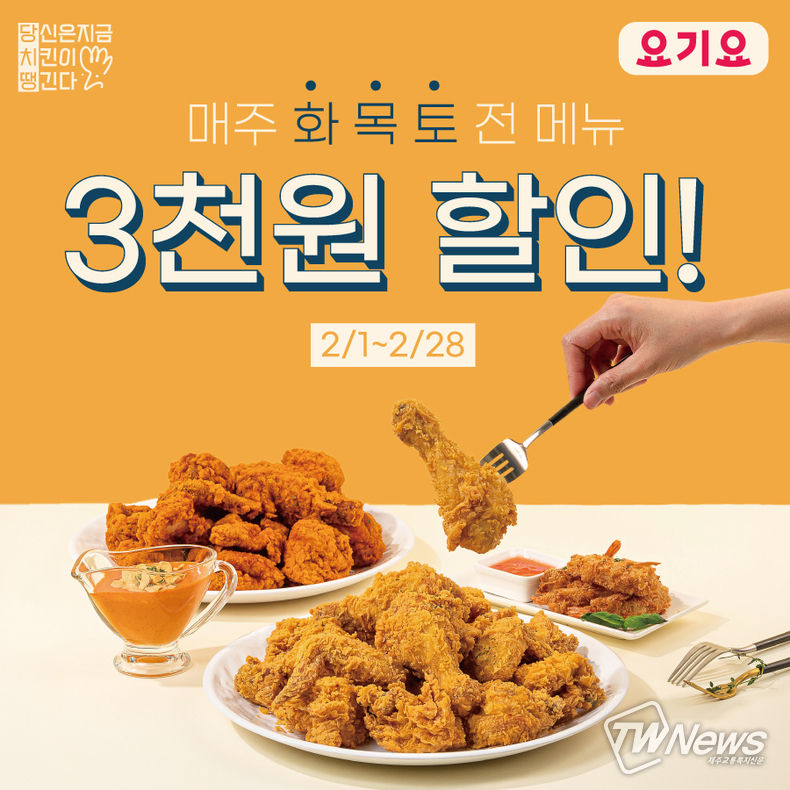 [제주교통복지신문 신혜정 기자] 치킨 브랜드 당신은 지금 치킨이 땡긴다(이하, 당치땡)이 요기요 주문 고객을 대상으로 전 메뉴 3,000원 할인 프로모션을 진행한다고 밝혔다.