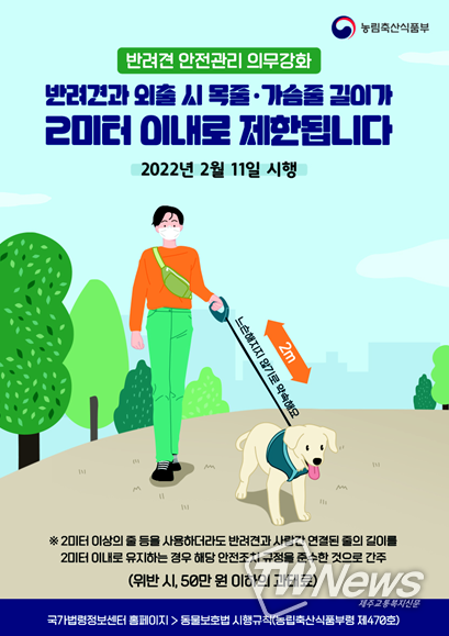 [제주교통복지신문 김대훈 기자] 농림축산식품부는 반려견 보호자가 반려견과 외출 시 ①목줄 또는 가슴줄 길이를 2m 이내로 유지하고, ②공용주택 등의 내부 공용공간에서는 반려견을 직접 안거나 목줄의 목덜미 부분을 잡는 등 관리할 내용을 규정한 「동물보호법 시행규칙」이 2022년 2월 11일부터 시행된다고 밝혔다.