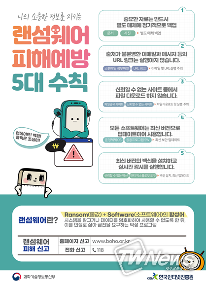 [제주교통복지신문 김대훈 기자] 과학기술정보통신부는 한국인터넷진흥원와 함께 인터넷을 활용한 온라인 생활이 일상화에 따른 부작용으로 금품요구악성프로그램(랜섬웨어) 침해사고가 증가됨에 따라 랜섬웨어 침해사고 주의보를 발령했다.