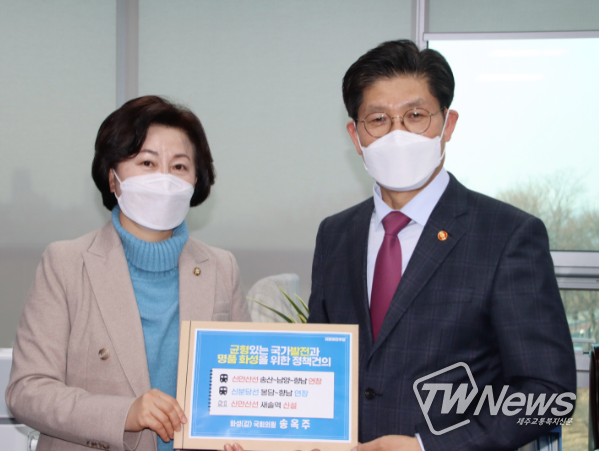[제주교통복지신문 김대훈 기자] 경기 화성(갑) 송옥주 국회의원(더불어민주당·국회 여성가족위원회 위원장·환경노동위원회)은 2월 10일(목), 국회 의원회관에서 국토교통부 노형욱 장관을 만나 화성시민의 교통복지 향상을 위해 신안산선 연장사업의 조기 확정에 협조해 줄 것을 촉구했다고 밝혔다.