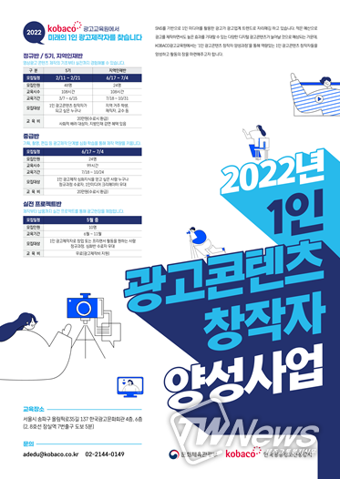 이번 사업은 정규교육 1개 과정, 특별교육 3개 과정, 광고 제작 공모전으로 구성했다. 정규교육은 광고 기획부터 촬영, 편집, 제작까지 광고의 전 과정을 배우는 실습 중심의 통합(원스톱) 교육으로서 3월부터 6월 중순까지 총 4개월간 진행하며, 광고 제작을 위한 스튜디오와 높은 사양의 촬영 및 편집 장비를 갖춘 교육시설을 제공한다. 수강생은 2월 11일부터 21일까지 48명을 모집한다. 더욱 자세한 신청 방법은 코바코 광고교육원 누리집에서 확인할 수 있다.