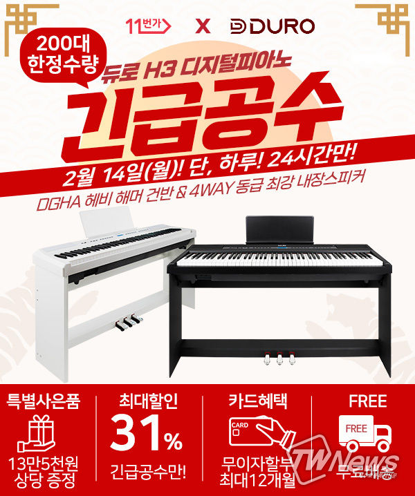 [제주교통복지신문 김지홍 기자] 11번가가 디지털 전자피아노 ‘듀로 H3’에 대해 오는 14일 단 하루, 긴급 공수 행사를 통해 할인 및 사은품 증정 행사를 진행한다고 12일 밝혔다.