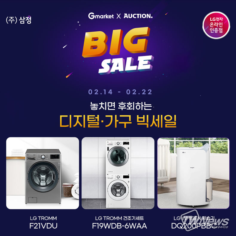 지마켓 빅스마일데이에서 ▲LG 트롬 21kg 드럼세탁기 실버 색상 F21VDU ▲LG 트롬 19kg 드럼세탁기 + 16kg 건조기세트 화이트 색상 F19WDB-6WAA ▲LG 트롬 21kg 드럼세탁기 + 16kg 건조기세트 실버 색상 F21VDU-6VAA ▲LG 휘센 제습기 20L 블루 DQ200PBBC 등을 만나볼 수 있다.
