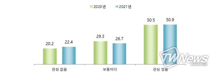 학생들은 남북관계가 평화로운지 묻는 질문에 대해 ‘보통이다’(48.8%), ‘평화롭지 않다’(30.2%), ‘평화롭다’(21.1%) 순으로 대답했으며, 2020년 조사에 비해 ‘평화롭다’는 인식이 증가한 것으로 나타났다.