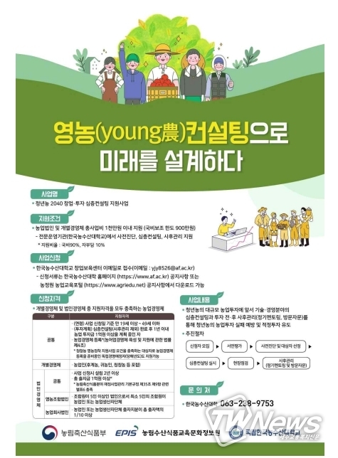[제주교통복지신문 김대훈 기자] 한국농수산대학교는 ‘2022년 청년농 2040 창업·투자 심층컨설팅 지원사업’의 참여자를 3월 31일까지 모집한다.