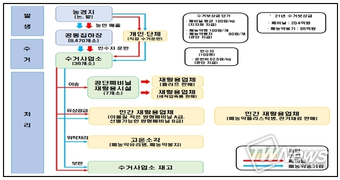한편, 환경부는 이물질이 많고 수익성이 낮아 민간에서 재활용을 기피하는 영농폐비닐을 효율적으로 처리하기 위해 '영농폐비닐 재활용처리시설 설치·개선' 사업을 추진하고 있다.