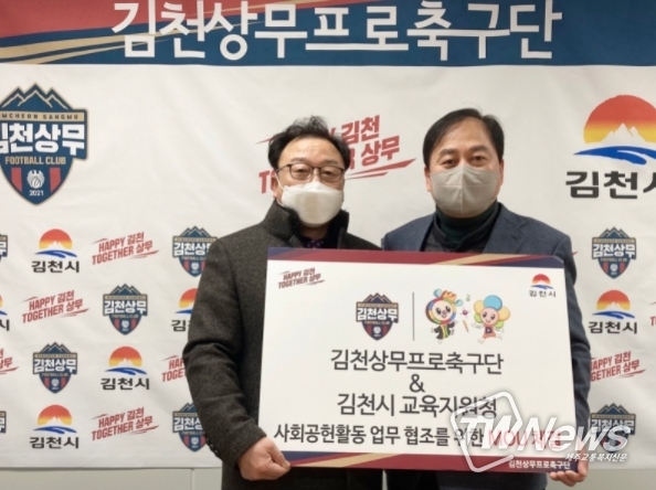 김천상무프로축구단이 23일 오후 1시 30분, 대표이사실에서 김천시 교육지원청과 양해각서(MOU)를 체결했다. 이날 MOU에는 김천상무 배낙호 대표이사, 교육지원청 박삼봉 교육장이 참석했다.
