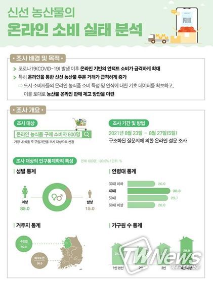 이번 조사는 리서치 전문기관의 소비자 패널을 기반으로 지난해 8월 23일부터 5일간 온라인으로 이뤄졌다. 조사 대상자는 온라인 농식품 구매자 중 가정에서 식품을 주로 구입하는 소비자이며, 지역, 연령 비율을 반영한 할당표집법에 의해 표본을 구성했다.