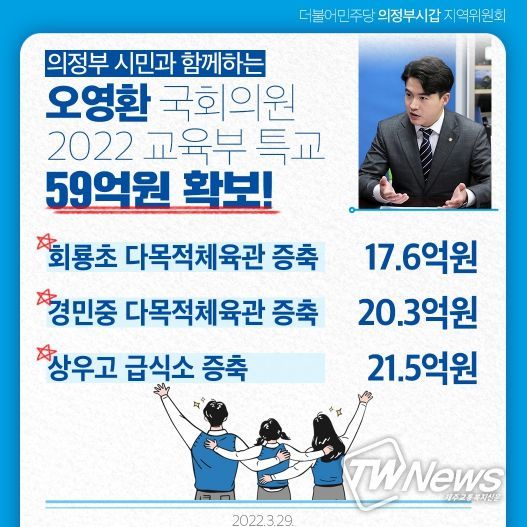 [제주교통복지신문 김대훈 기자] 오영환 국회의원(더불어민주당, 의정부시 갑)은 의정부 교육환경 개선을 위한 2022년도 상반기 교육부 특별교부금 59억원이 확정됐다고 29일 밝혔다.