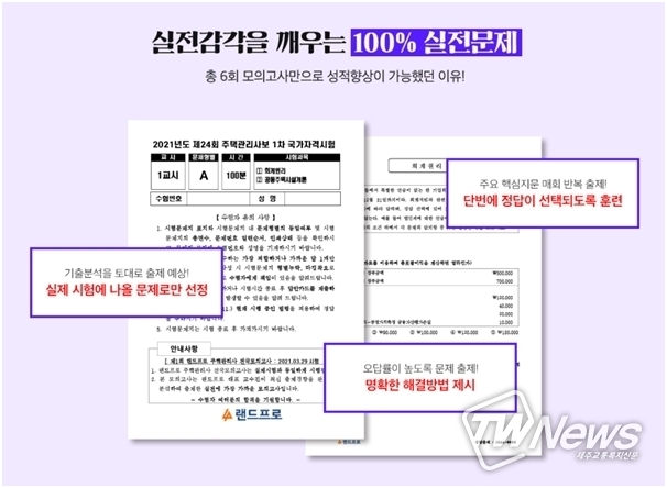 업체 관계자는 “주택관리사 수험생들이 시기별로 실력을 점검할 수 있도록 총 6회 전국 모의고사를 진행할 예정이다. 첫 번째 제1회 전국모의고사는 1, 2차 시험과목별 이론 학습 상태를 점검하고 실전 감각을 키워주는 데 많은 도움이 될 것”이라고 전했다.