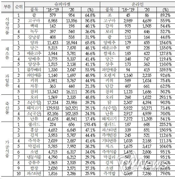 구색과 가격 경쟁력을 갖춘 슈퍼마켓에서 신선 농산물(1.2%p)과 가공식품(3.4%p)을 구매하는 비중이 증가했다.