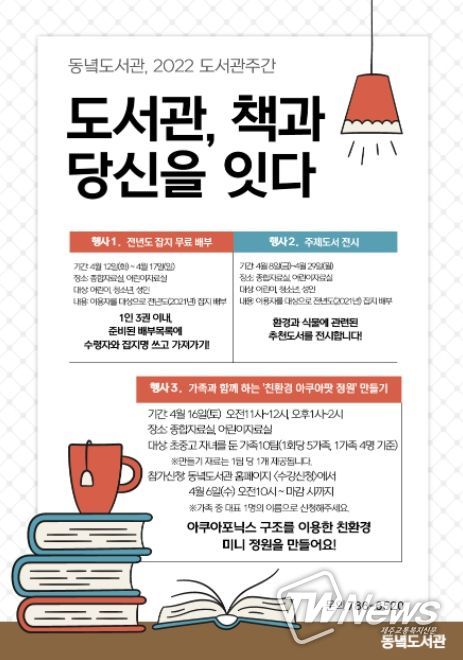 또한, 어린이 자료실 및 종합자료실에서는‘전년도 잡지 무료배부’(1인 3부 이내),‘환경·식물 관련 주제도서 전시’를 진행한다.
