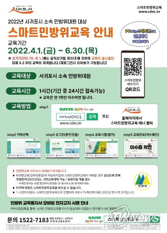 서귀포시 관계자는 “민방위 교육으로 온라인으로 전환됨에 따라 민방위대원들의 부담완화를 기대하며, 민방위 교육 미이수시 과태료가 부과되는 만큼 반드시 기간 내에 교육을 이수할 수 있도록 민방위 대원들의 적극적인 협조와 관심을 부탁드린다”고 당부하였다.