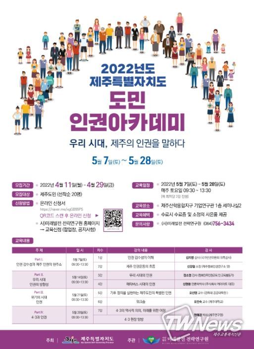 상반기 도민 인권아카데미는 5월 7~28일 매주 토요일 9시 30분에 열리며, 전문적이고 체계적인 인권교육을 위해 ㈔미래발전 전략연구원에서 운영을 담당한다.