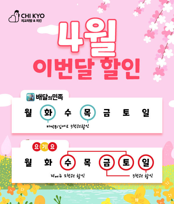 또한, 요기요 이용 고객들은 4월 매주 수요일, 토요일에 치교치밥 메뉴 배달, 포장 시 2000원 할인권을 받을 수 있다. 4월 매주 금요일, 일요일에는 치교치밥 메뉴 배달 시 3000원 할인권이 증정된다.