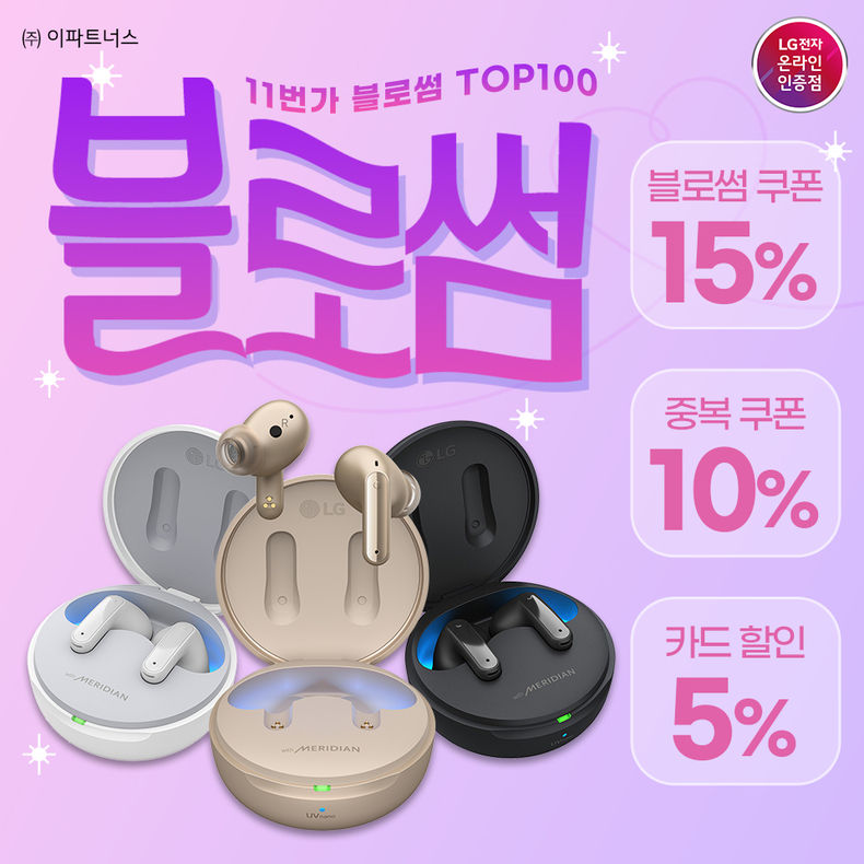 [제주교통복지신문 박희찬 기자] 본격적인 봄을 맞이해 LG전자 공식 전문점 ‘이파트너스’가 11번가 ‘블러썸(Blossom) 브랜드 톱 100’ 행사를 통해 무선 블루투스 이어폰 LG톤프리, 톤플러스 및 스피커 등 LG 음향 가전 할인전 행사를 진행한다고 30일 밝혔다.