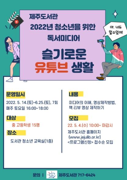 [제주교통복지신문 박희찬 기자] 제주특별자치도교육청 제주도서관은 청소년들의 능동적이고 비판적인 미디어 활용 습관을 기르는 데 도움을 주고자‘2022 청소년을 위한 독서미디어슬기로운 유튜브생활’참가자를 모집한다.