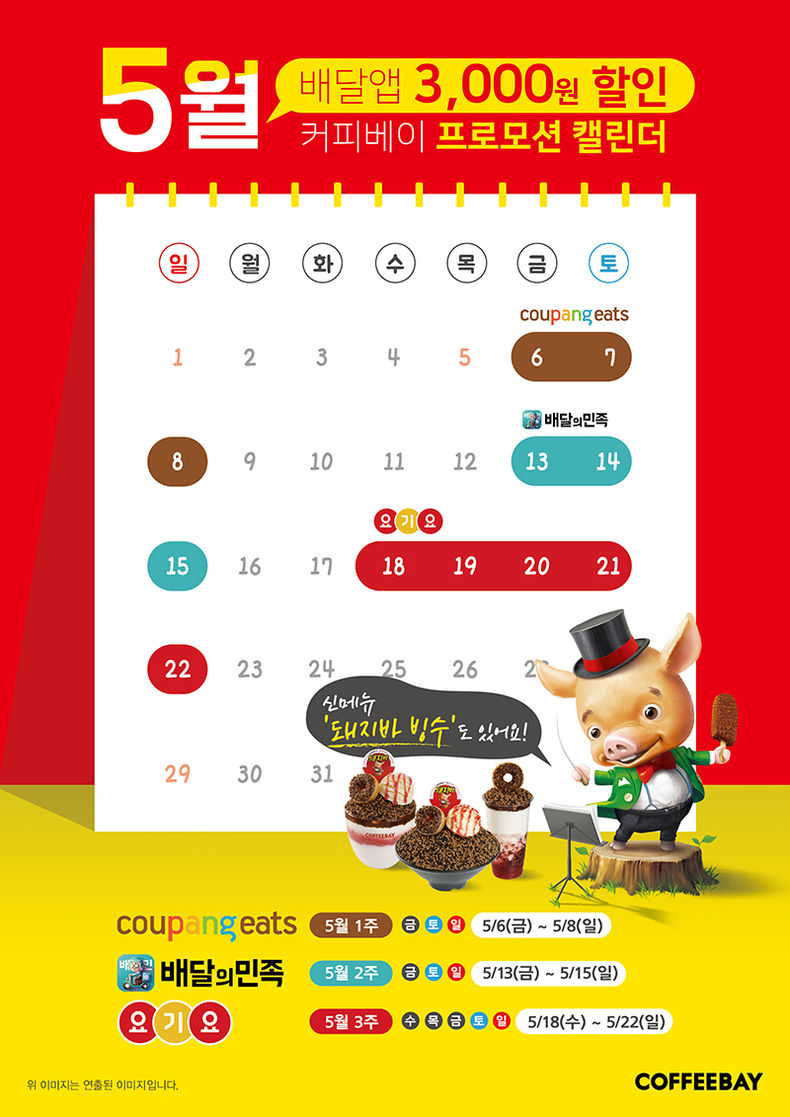 모든 할인 프로모션은 배달 주문이 많은 주말에 실시하며 12000원 이상 주문 시 3000원 할인 쿠폰을 제공한다. 5월 1주인 6일부터 8일까지 3일간은 쿠팡이츠에서, 둘째 주 13일부터 15일까지 3일간은 배달의민족에서, 셋째 주 18일부터 22일까지 5일간은 요기요에서 할인 쿠폰을 증정한다.