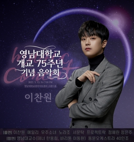 가수 이찬원이 ‘영남대학교가 개교 75주년 기념음악회’에 출격하며 모교로 금의환향하며, 이번에 마지막 무대인 ‘엔딩 공연’이 확정이 됐다. 영남대학교는 이외에도 개교 75주년을 맞이해서 다양한 행사가 펼쳐질 예정이라고 전했다.