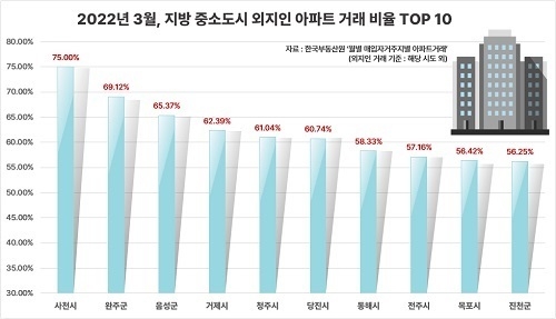 매매시장에서도 상황은 마찬가지다. 한국부동산원 자료를 보면 충북 충주시의 경우 올 1분기 매매 건수 가운데 외지인 거래가 전체의 50.88%로 1년 전(35.81%)보다 15.06%p 증가했고, 경남 거제시의 경우에도 1분기 외지인 거래비율이 60.90%에 달해 지난해(50.71%)에 비해 10.19%p가 오르는 등 외지인 유입이 활발히 이뤄졌다.