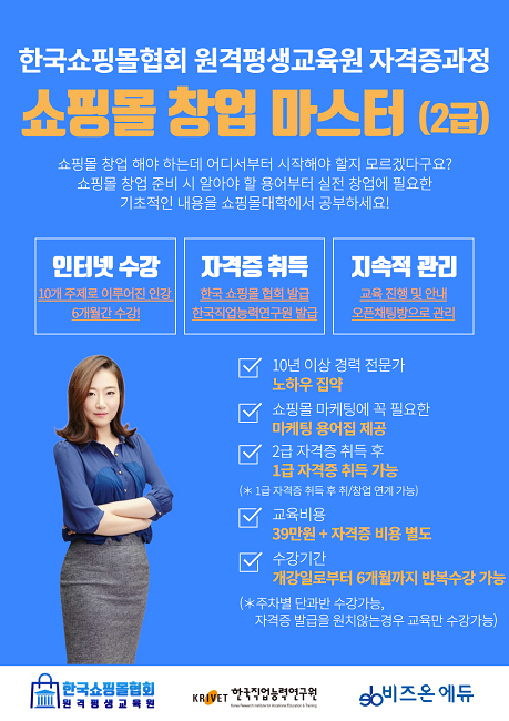 자격증 발급은 민간자격증으로 한국쇼핑몰협회 원격평생교육원과 한국직업능력연구원에서 발급한다.