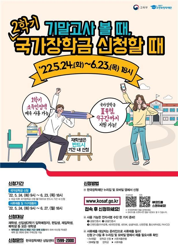 [제주교통복지신문 이소민 기자] 교육부와 한국장학재단(이사장 정대화, 이하 ‘재단’)은 2022학년도 2학기 국가장학금 신청을 오는 24일 9시부터 6월 23일 18시까지 접수한다고 23일 밝혔다.