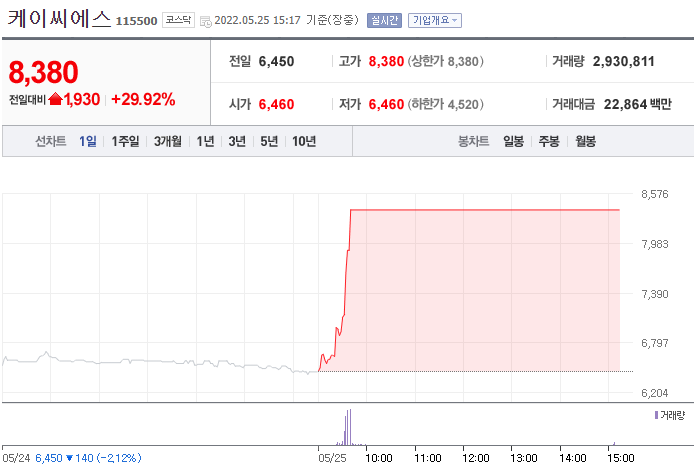 25일 오후 3시 17분 기준 케이씨에스는 전 거래일 대비 29.92%(1930원) 오른 8380원에 거래되고 있다.