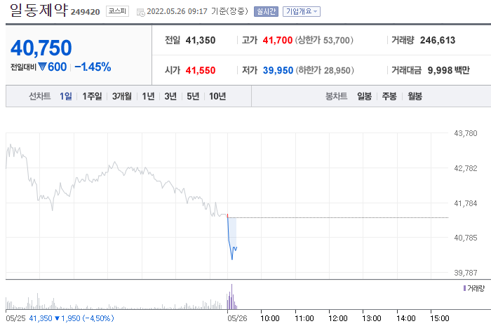 26일 오전 9시 17분 기준 일동제약은 전 거래일 대비 1.45%(600원) 하락한 4만750원에 거래되고 있다.