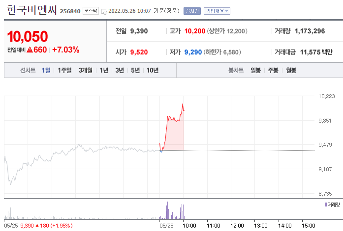26일 오전 10시 7분 기준 한국비엔씨는 전 거래일 대비 7.03%(660원) 상승한 1만50원에 거래되고 있다.