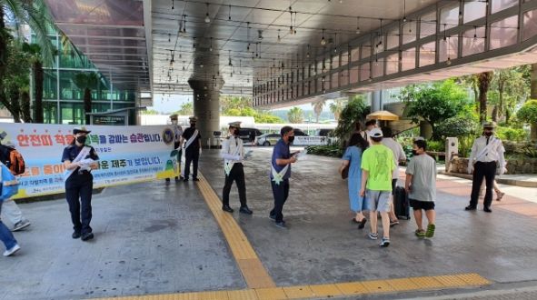 이날 자치경찰단, 교통안전공단과 렌터카조합 등 30여 명이 참석한 가운데 전단지와 방역물품(마스크)을 배부하는 등 렌터카 이용객 대상 과속운전 예방 및 전 좌석 안전띠 생활화 등 교통안전에 대한 경각심을 높이기 위한 홍보 활동을 펼쳤다.
