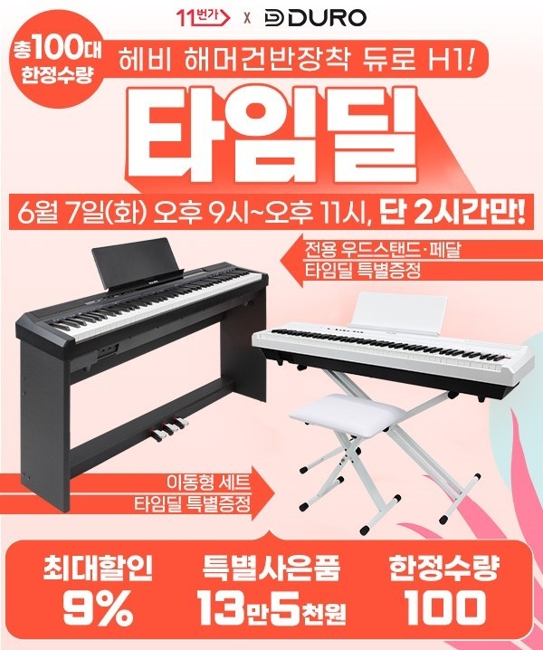 [제주교통복지신문 민진수 기자] 듀로 H1 디지털피아노 제품을 할인가로 구매할 수 있는 타임딜 이벤트가 오는 7일 11번가를 통해 진행된다고 4일 밝혔다.