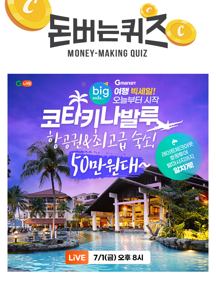 제시된 돈버는퀴즈 문제는 'G마켓 여행 빅세일 오늘부터 시작! 그 첫 포문을 연 여행지는 해변가에서 보는 아름다운 석양이 일품인 OOOOOO인데요. OOOOOO 항공권 & 최고급 숙소 패키지를 딱 한시간 동안 50만원대부터 만나볼 수 있다는 것! 여기서 OOOOOO에 들어갈 단어는 무엇일까요?'이다.