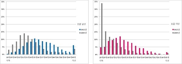 결혼정보업체 듀오의 성혼회원 평균 초혼 연령은 남성 37.0세, 여성 33.9세이다. 17년 전(2005년 남 33.8세, 여 30.4세)과 비교해 남성은 3.2세, 여성은 3.5세 올랐다. 올해 통계청이 발표한 평균 초혼 나이(남 33.4세, 여 31.1세)보다는 남녀 각각 3.6세, 2.8세씩 높았다.