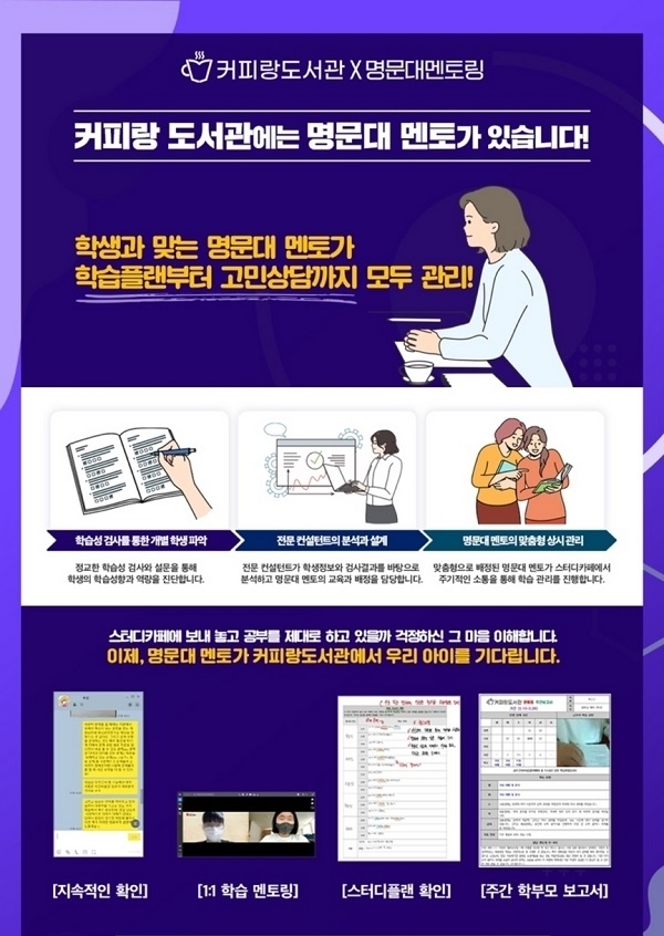 [제주교통복지신문 김도형 기자] 국내 최초 스터디 카페 개발 업체인 커피랑도서관은 업계 유일한 유인 시스템의 장점을 활용해 1:1 명문대 슈퍼 멘토 서비스를 출시한다고 11일 밝혔다.