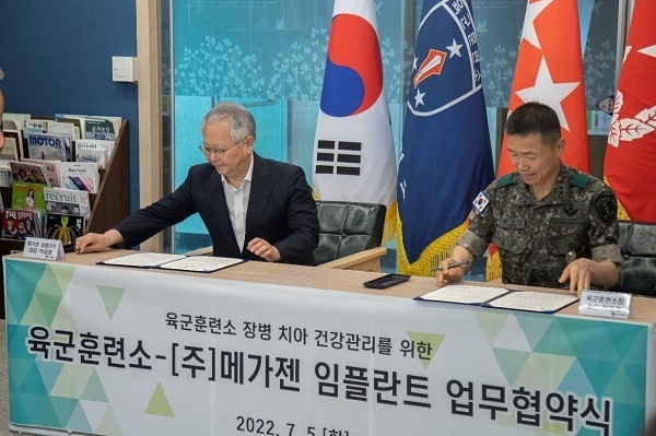 이번 업무협약으로 메가젠은 ESG 경영의 일환으로 임플란트 진료 지원 및 구강 관리 용품 등을 육군훈련소에 지속 제공한다.