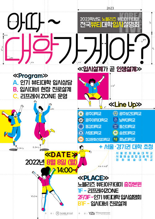 [제주교통복지신문 김현 기자] 노블리즈 뷰티아카데미가 오는 8월 8일 오후 2시 충장 본원에서 2023학년도 미용대학 입시설명회 ‘대학가게야?’를 개최한다고 25일 밝혔다.