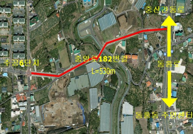 본 구간은 주공6단지와 동홍로를 연결하는 도시계획도로(L=0.53km, B=13m) 개설사업으로 2022년 6월에 개통하여 보행자 및 운전자들의 통행이 많은 구간이지만 가로등 설치가 되지 않아 도로가 어두워 시민들이 야간통행에 불편을 겪고 있는 구간이었다.