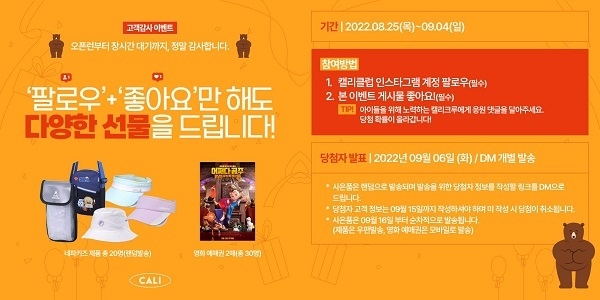 캘리클럽 관계자는 “이번 이벤트는 캘리클럽 인스타그램 공식계정 팔로우와 이벤트 게시물에 좋아요만 해도 참여가 가능하며, 감사의 마음을 전하기 위해 참여방법을 최소화했다”며 “추첨을 통해 네파 키즈 모자와 가방 용품 등을 랜덤으로 20명에게 제공하고, 9월 8일 추석 명절을 앞두고 극장 개봉 예정인 ‘어쩌다 공주, 닭냥이 왕자를 부탁해!’ 예매권 2매를 30명에게 지급, 총 50명에게 다양한 선물을 제공한다”고 밝혔다.