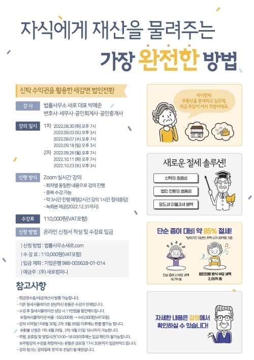 [제주교통복지신문 이소민 기자] 자산관리 전문 로펌 법률사무소 새로(대표 박예준 변호사)는 증여의 효과를 볼 수 있으면서도 획기적으로 절세하는 방안으로 ‘신탁수익권을 활용한 세감면 법인전환’을 제시했다. 이를 토대로 10월 11일과 23일 줌(ZOOM) 강의를 한다고 27일 밝혔다.