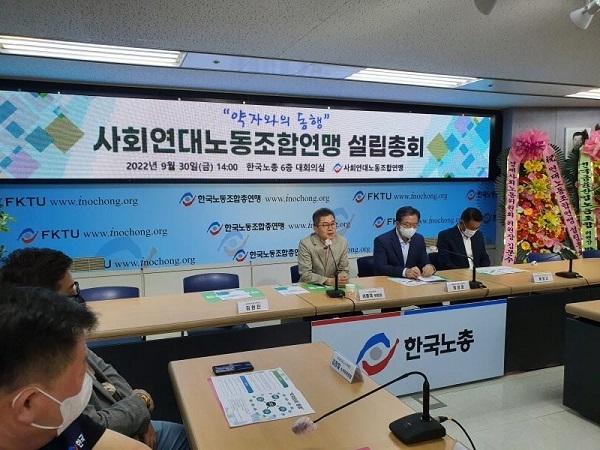 사회연대연맹(위원장 이충재)은 9월 30일 한국노총 대회의실에서 설립총회를 열고, “사회연대연맹은 소상공인·노인·청년·외국인 등 한국사회의 다양한 계층과 세대·단체들을 아우르는 조직으로 우선 한국노총에 직가입 형태로 가입하고, 2024년까지 10만 조직화를 목표로 뛰겠다”고 4일 밝혔다.