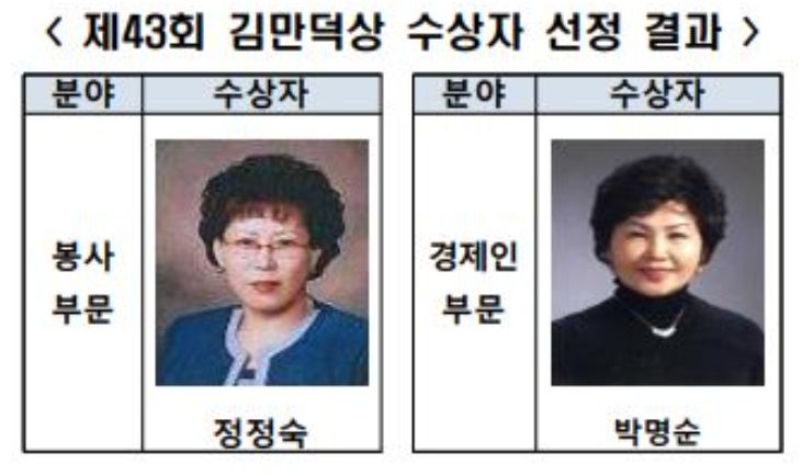 [제주교통복지신문 김현석 기자] 제43회 김만덕상 수상자로 봉사 부문에 정정숙 씨, 경제인 부문에 박명순 씨가 선정됐다.