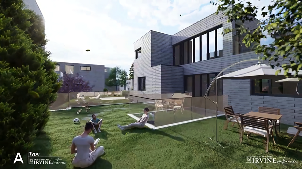 어바인 타운하우스는 면적 40,478㎡, 건폐율 26%, 용적률 100%의 120세대 대단지 규모로 들어서며, 시행은 ㈜코리아에스이가 맡았다.