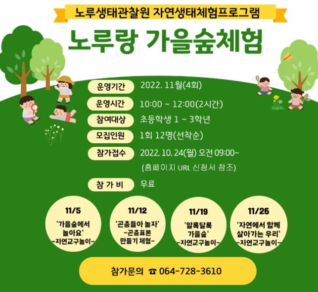 이번 프로그램은 노루생태관찰원 내 거친오름 등 숲에서 초등학교 1~3학년 대상으로 11월 한 달간 매주 토요일(10시~12시) 4회에 걸쳐 운영되며 숲속식물 및 곤충 등을 주제로 ▲가을 숲에서 놀아요 ▲곤충들아 놀자 ▲알록달록 가을 숲 ▲자연에서 함께 살아가는 우리로 숲에서 자연을 오감으로 느끼고 관찰할 수 있는 공간놀이, 만들기 체험 프로그램으로 진행될 예정이다.