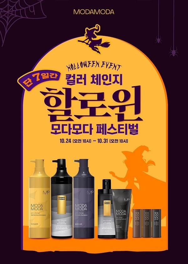 업체 측에 따르면 지난 24일부터 31일까지 7일간 진행되는 ‘컬러 체인지 할로윈 모다모다 페스티벌’은 ‘블랙 샴푸(300g)’ 2개 세트, ‘블랙 샴푸(300g)X블론드 샴푸(300g)’ 세트 등 모다모다의 주요 제품 대상으로 최대 27% 금액 우대 혜택을 제공한다.