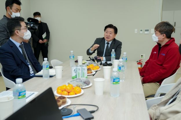 오영훈 지사는 27일 오후 제주혁신도시 복합혁신센터에 자리 잡은 워케이션 오피스를 방문해 제주도의 워케이션 프로그램에 참여하고 있는 위메이드 그룹 ㈜전기아이피 직원들과 다양한 의견을 나눴다.