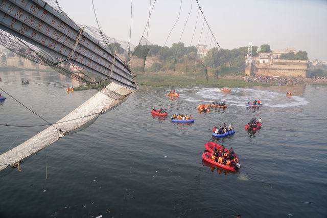 30일(현지 시각) NDTV 등 인도 현지 매체에 따르면 이날 오후 인도 서부 구자라트주 모르비 지역 마추강을 가로지르는 현수교가 붕괴돼 최소 140명 이상이 숨졌다. 이번 사고는 매년 10~11월 열리는 디왈리 행사 기간이 벌어져 큰 인명피해를 낳았다.