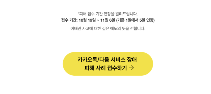 지난 31일 카카오는 ‘먹통 사태’ 관련 피해접수 기간을 연장했다고 공지했다. 기존 마감 기간은 11월 1일이었으나 11월 6일까지로 늘렸다.