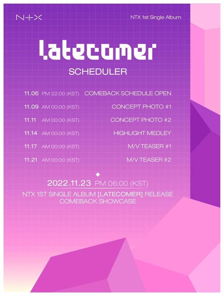 또한 이와 함께 컴백 소식을 전했다. 소속사 측은 "오는 23일 오후 6시 NTX(엔티엑스)의 새로운 앨범 'NTX 1st SINGLE ALBUM 'LATECOMER''을 정식 발매한다"라고 전했다.