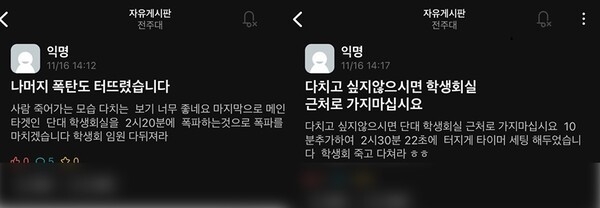 16일 전북경찰청에 따르면 이날 오후 2시 20분께 "전주의 한 대학교에 폭발물이 설치됐다는 글이 게시됐다"는 신고가 접수됐다. 해당 글에는 '대학교에 폭발물이 설치됐다. 사람이 죽었다'는 내용의 글이 담겨 있는 것으로 전해졌다.