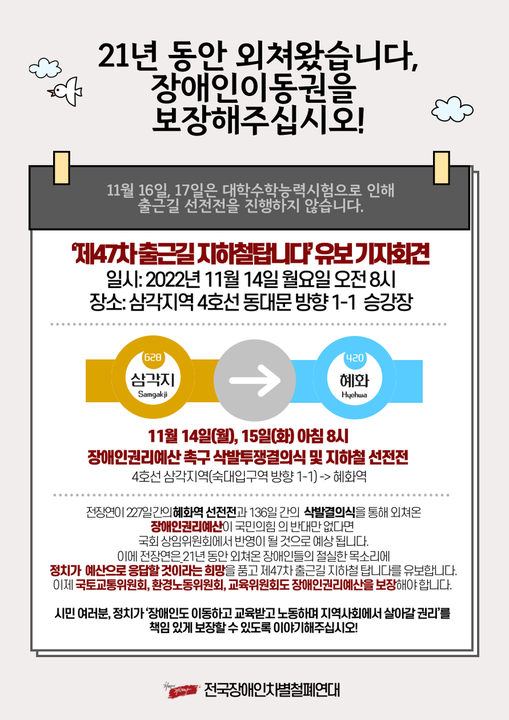 한편 전장연은 장애인권리예산을 요구하며 지난해 12월 3일부터 출근길에 지하철을 타고 있다. 이들은 △2023년 장애인활동지원예산 2조9000억원 편성 △권리 기반 활동 지원 제도 정책 마련 △2023년 탈시설 자립지원 시범사업예산 807억원 편성 △기존 거주시설 예산의 탈시설 예산 변경사용 △장애인 이동권 예산 제도 개선 △만 65세 미만 노인장기요양 등록 장애인의 활동 지원 권리보장 등을 요구하고 있다.
